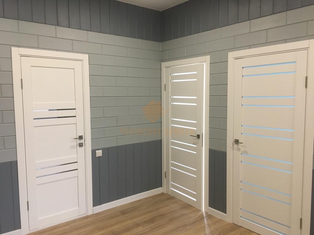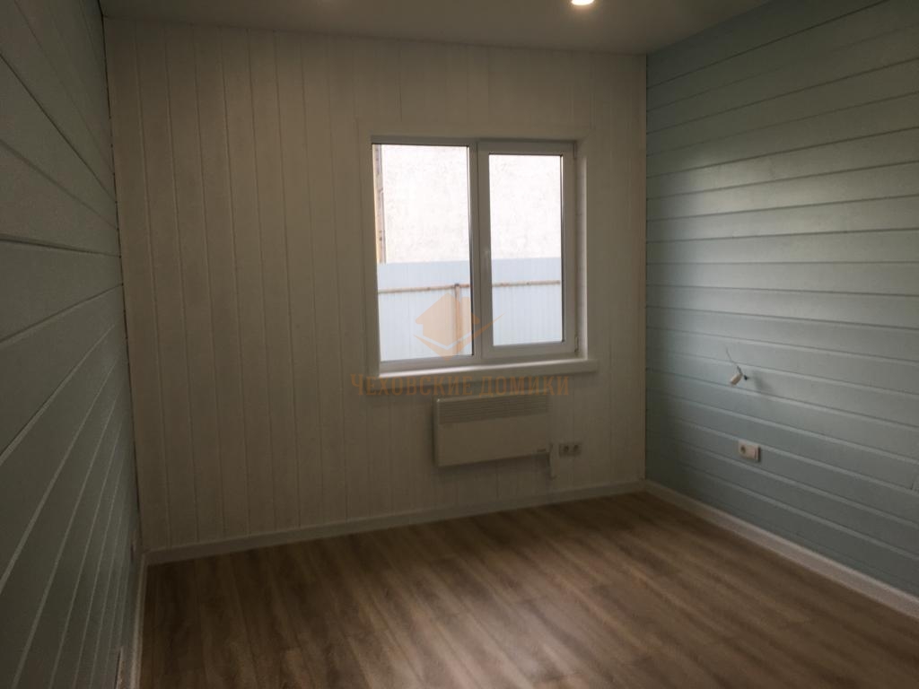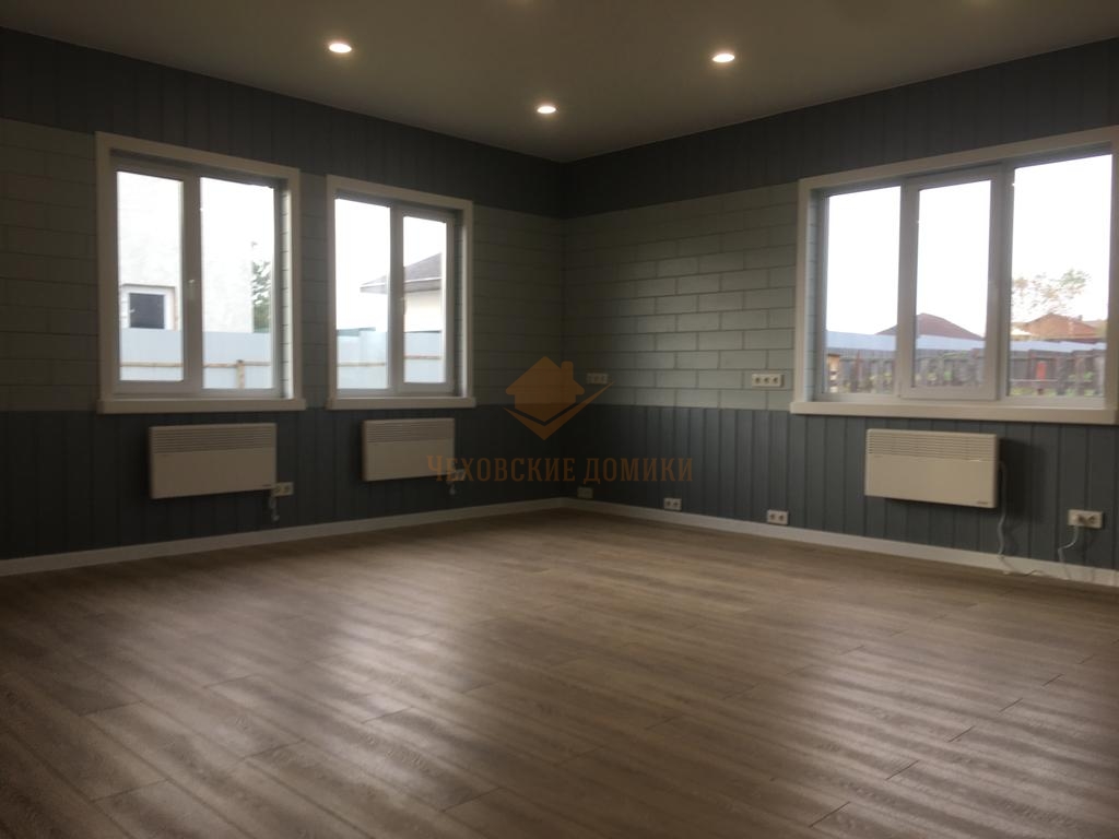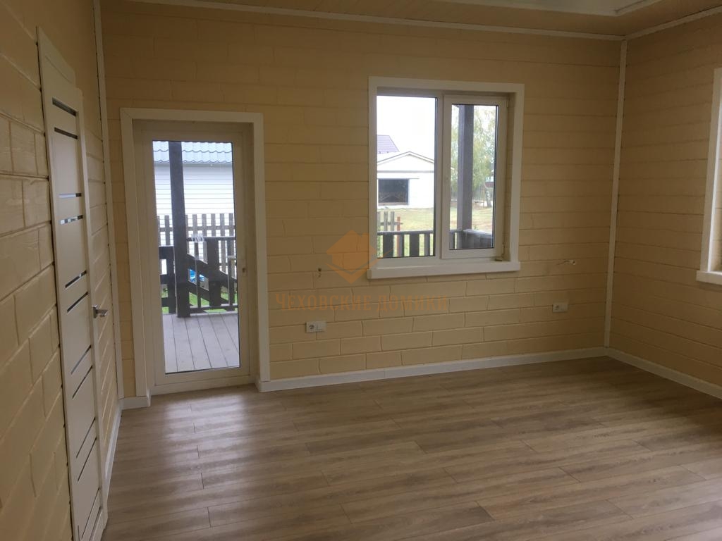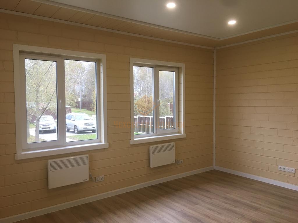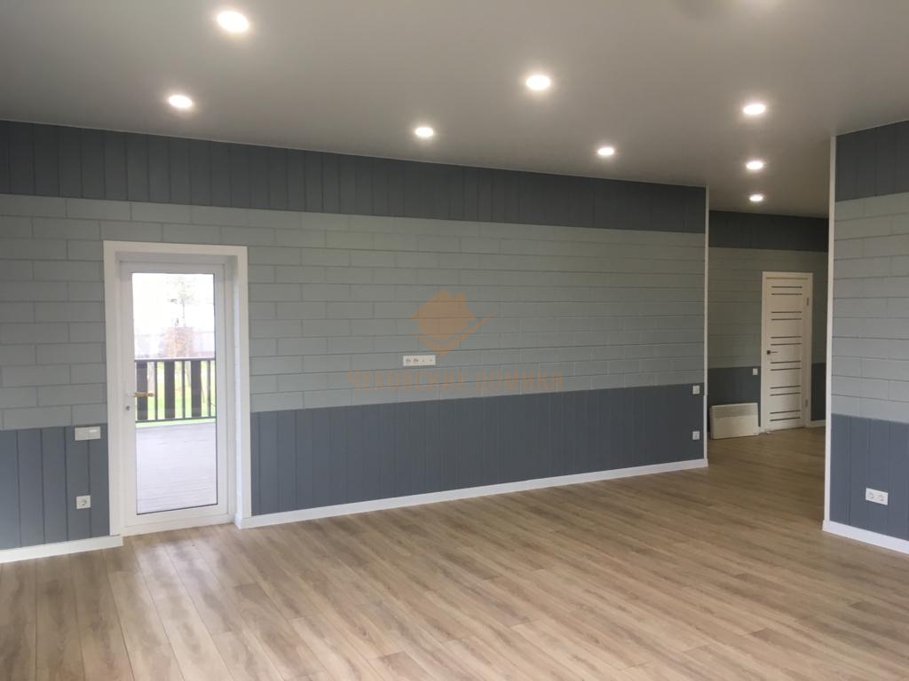Стены внутри дома отделаны блок хаусом с декоративным рисунком. Потолки- натяжные высотой 285см.