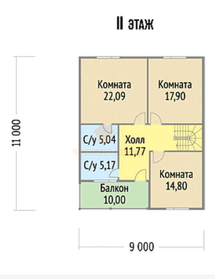 Второй этаж: холл, 2 санузла, 3 спальни, балкон.