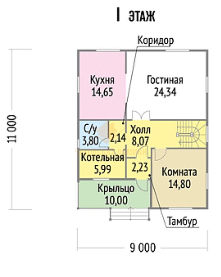 Первый этаж : крыльцо, холл, котельная, гостевая комната, ванная комната, совмещенная кухня с гостиной и выходом на веранду.